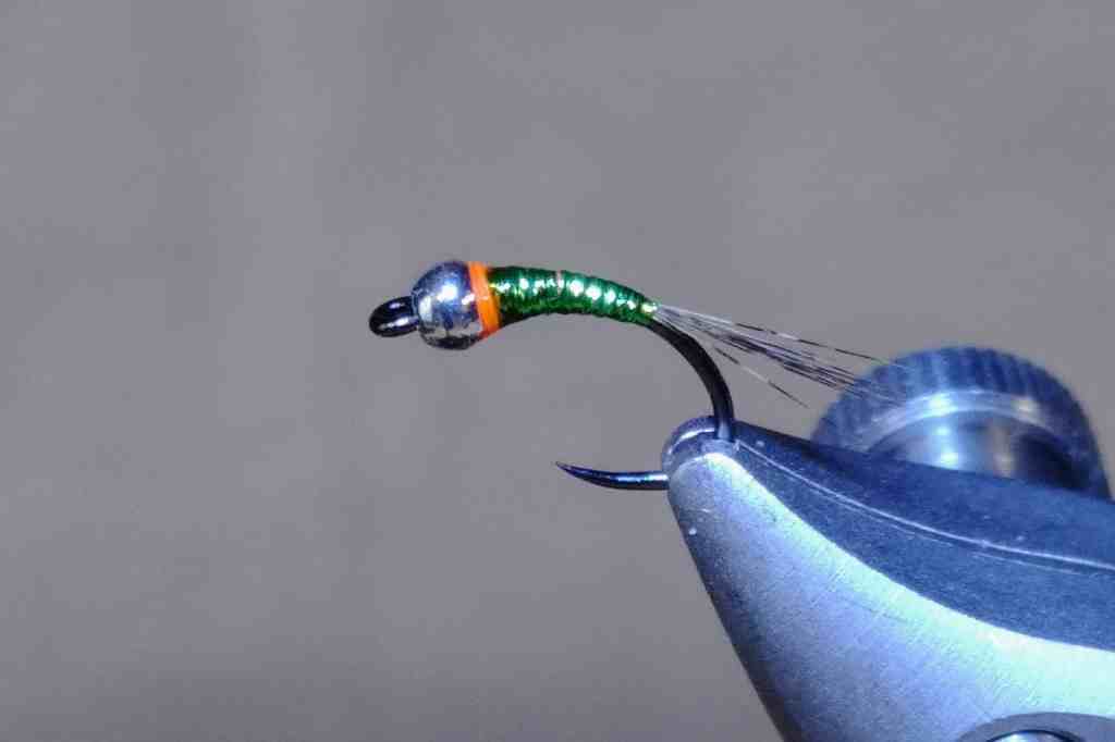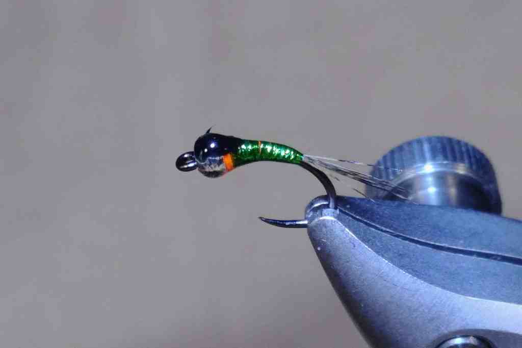 Tie in a single strand of Flashabou tinsel. Wrap the tinsel toward the bead making sure to cover all of the thread wraps. Capture it off and give it a whip finish. This variation is great in rivers with many Green Caddis. Sometimes, it will also omit the tail for that reason.