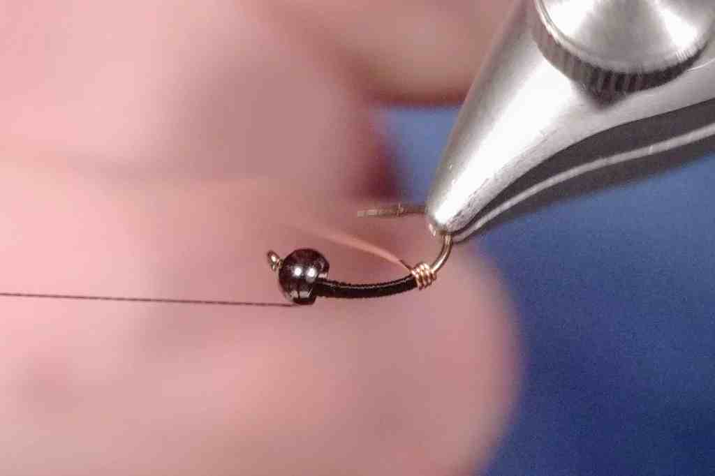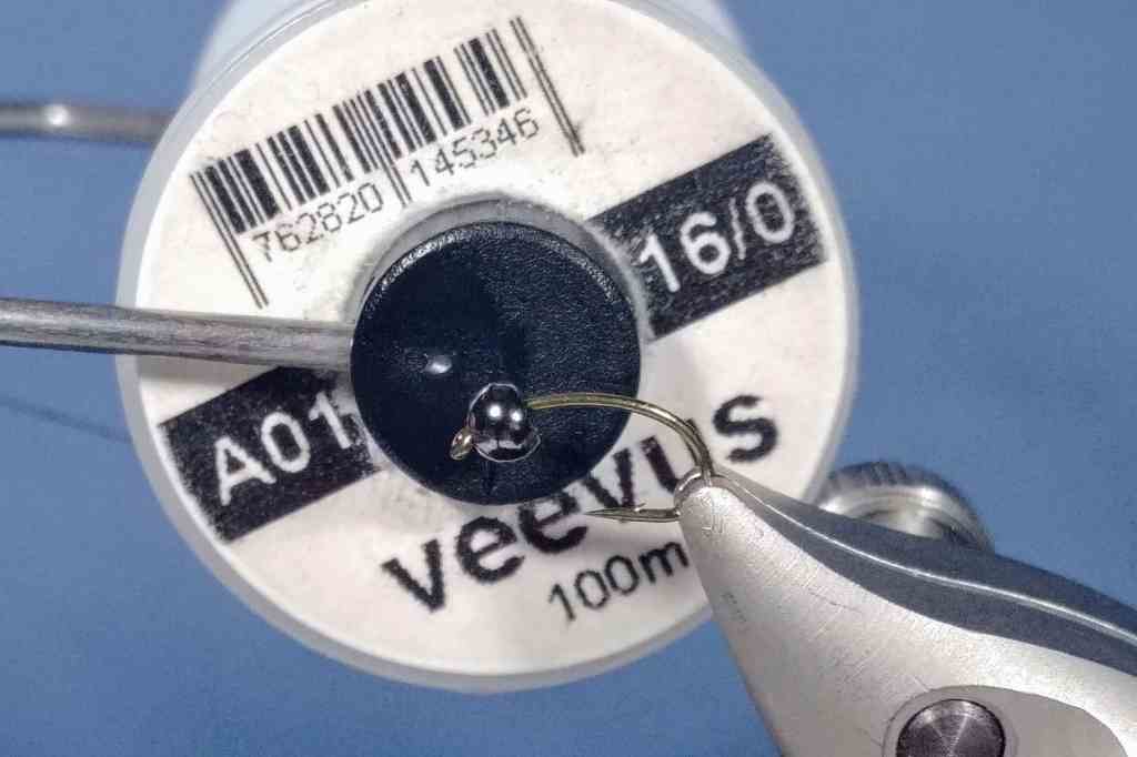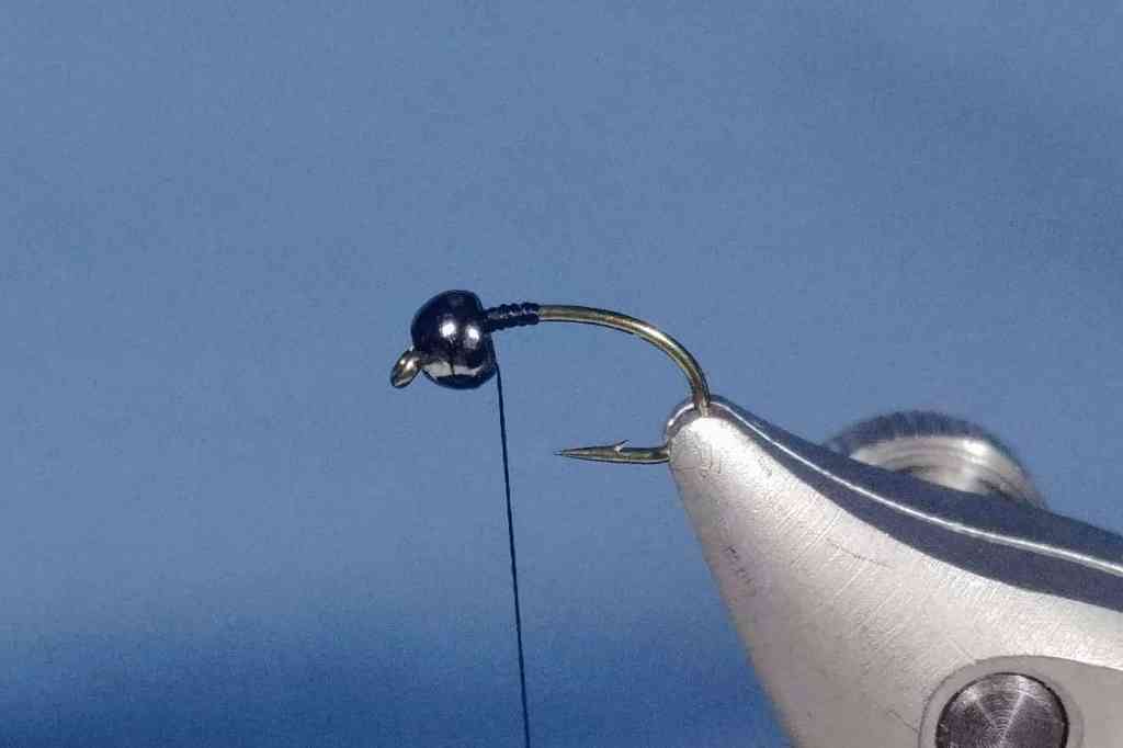 Slide the bead on the hook and fix it in the tying vise. Make just a few locking wraps to secure the tying thread to the hook behind the bead.