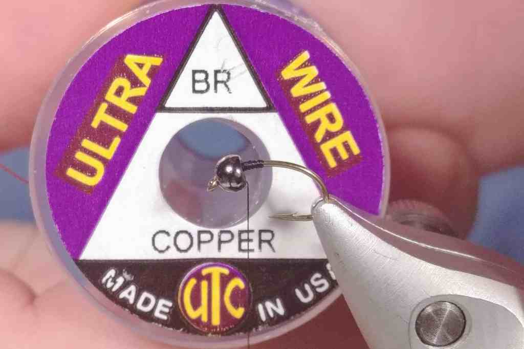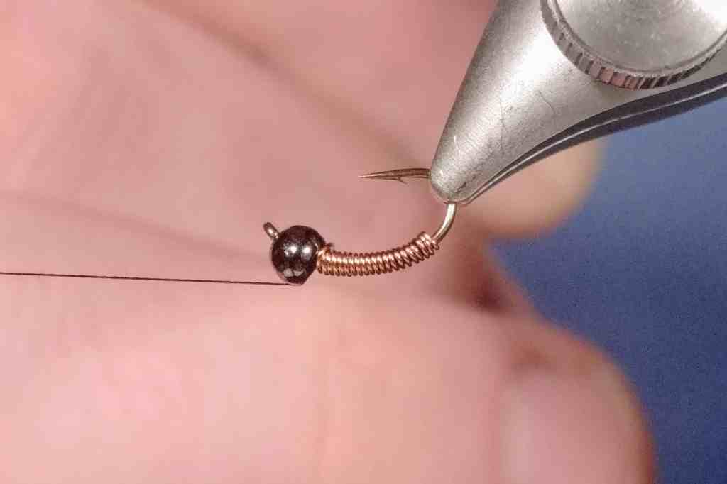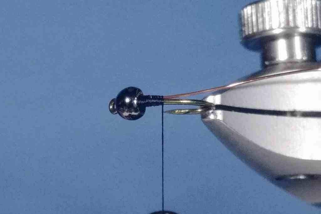 Select a strand of tying wire a few inches long and secure it on one side of the hook. Place the tip of the wire just inside the bead. Wrap it over the top all the way down the hook shank. Make sure to keep very smooth tread wraps throughout this process so the wire can lay nicely over top.