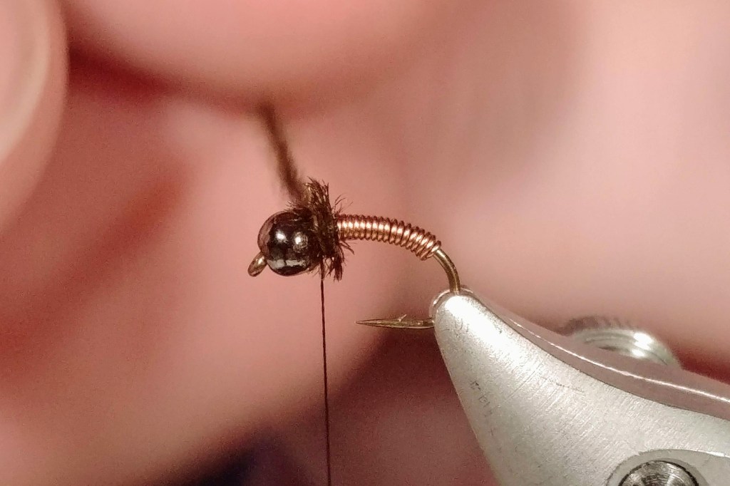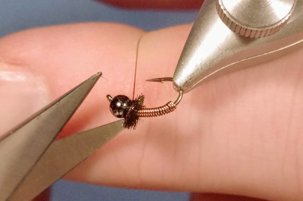 Pull one strand of peacock herl from the pack and clip the first half inch off the tip. This makes your tie-in point a little more durable. Tie in on one side of the hook, ensuring the longer side of the peacock herl is facing down. (Image three above). Palmer forward a few times right up to the bead and secure it with tying thread. Whip finish and fish!