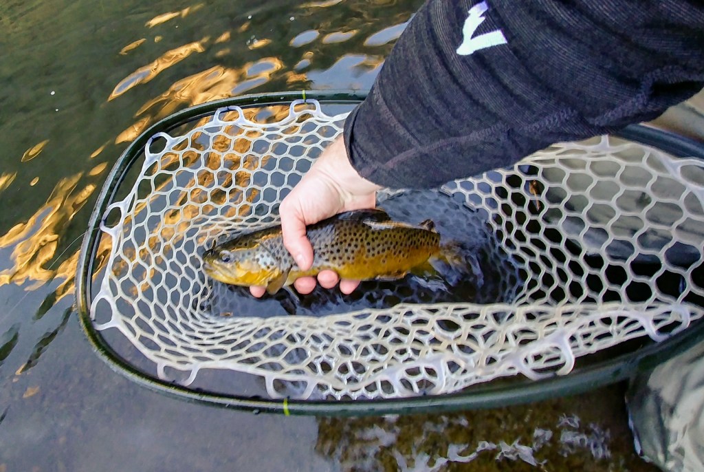 I tried to keep my composure and stealth while I finished tying on my confidence flies for this area. I was fishing a Rainbow Warrior as my lead/dropper fly and then a smaller natural Baetis nymph as the point. I made one cast right over the top of the fish. I had no other option as it was still holding directly upriver from me at this point. If I were to move at all, he would be gone. The cast was perfect, landing straight in the feeding current of the fish a few feet in front of it. As my indicator inched closer to the fish, I started watching to see if it would move to eat. It seemed to shift slightly one way and then back, and then again a little more dramatically the other direction. Without any sort of reaction on my indicator, I set the hook in hopes it moved to take my flies. Sure enough, FISH ON! After playing it quickly into the net, I discovered it actually took both flies. Almost as though it was put there for me to catch that morning, no matter what I did.
