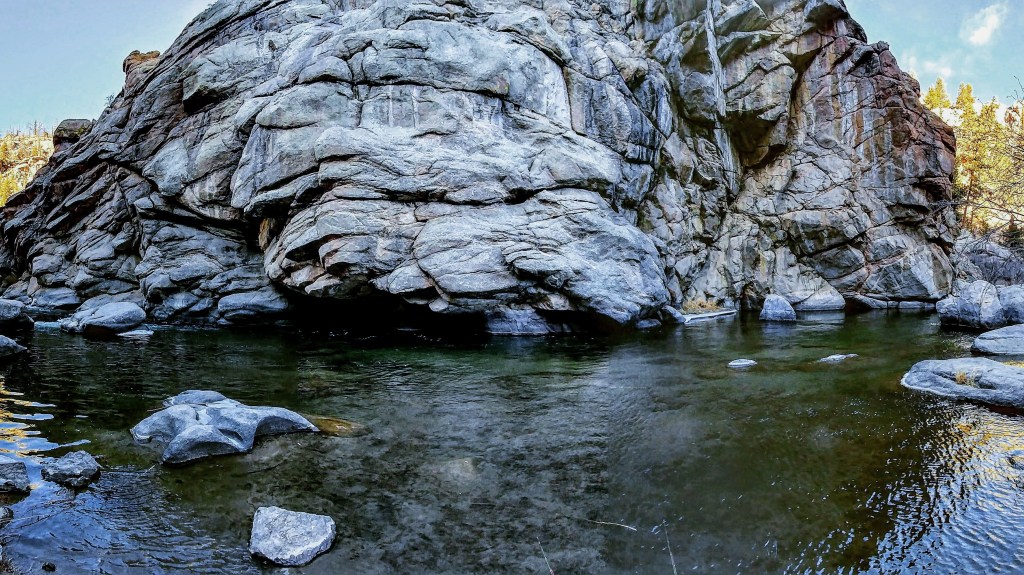 I start with a slightly above average-sized Brown Trout caught in Eleven Mile Canyon on a chilly winter day. I frequent this location and usually do pretty well there. The fish tend to be easier to fool than other parts of the South Platte River. You may even recognize this spot if you are familiar with the area. There is a large, distinctive overhanging rock cliff that spans the water.