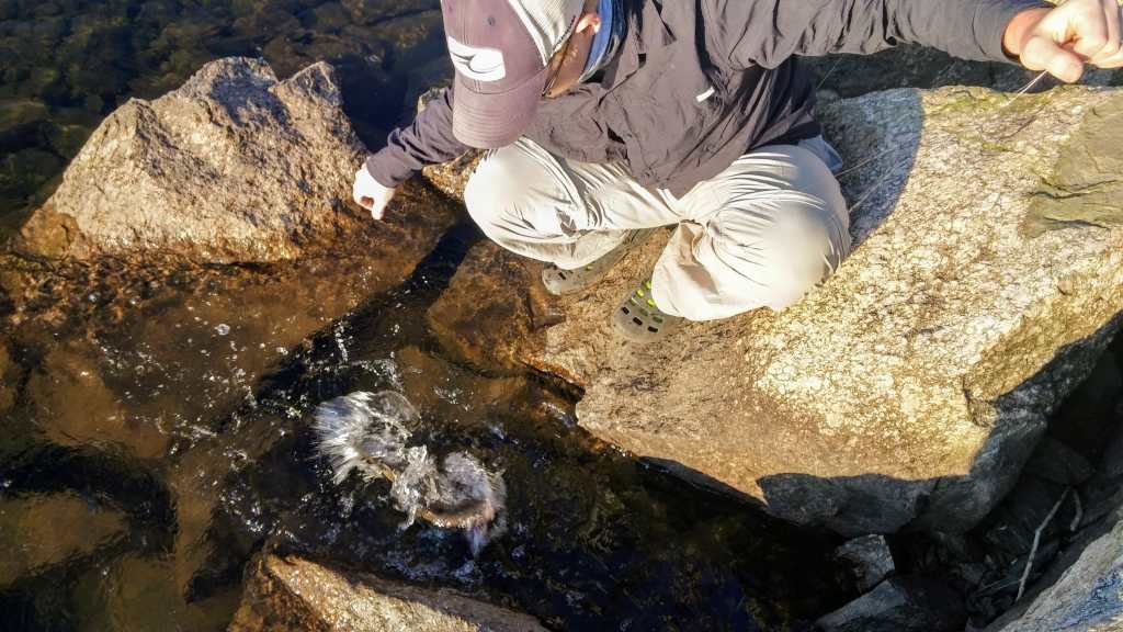 I struggled a little bit to get it in. It was fighting with might. I was positioned on a rock that was about three feet off the water with no net. I clumsily made my way down one side of the rock. I played the fish to an area of grass. There, I could land it.